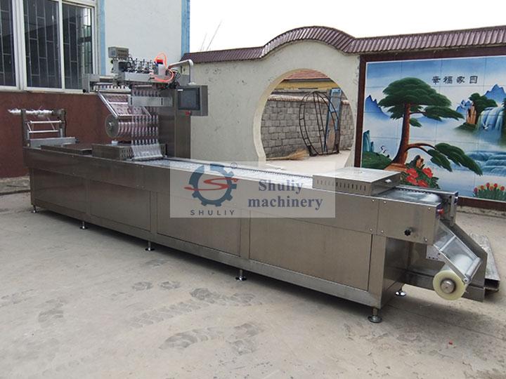 The vacuum packing machine is also called a fully automatic stretch membrane vacuum packaging machine. It can automatically extract the air in the packing bag. And it can complete the sealing process after reaching a predetermined vacuum degree. Vacuum packaging machines are often used in food, medicine, electronic products, and other industries. Automatic stretch film vacuum packing machine is mainly used for packaging all kinds of snack foods, such as chicken legs, ham, chicken feet, spiced corned egg, spicy strips, grilled fish fillets, beef jerky, sausages, meat, etc. Also, It can pack meat, seafood, etc.
