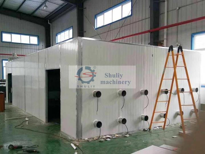 The drying machine adopts a fully enclosed structure and the hot air circulates in the box, which can shorten the drying time of the materials and ensures product quality. Generally, the dryer machine can reduce the materials’ moisture content from 40% to 8% during about 7-8 hours. And the machine has the features of easy installation, convenient demolition and relocation, and less floor space.